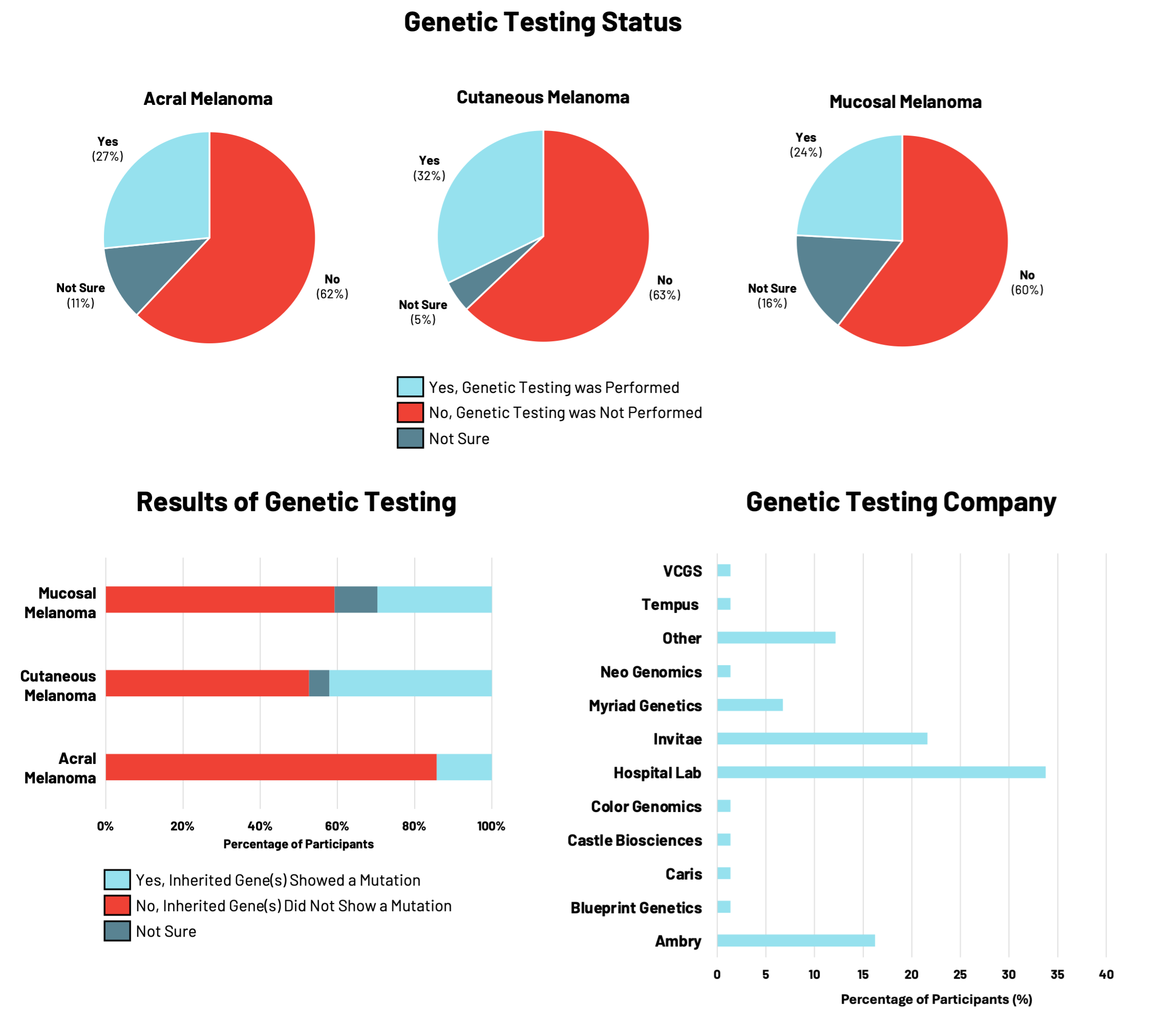 Compared to cutaneous (skin) melanoma, much less is known about the genetic risk factors (inherited mutations) or genetic tumor biomarkers (acquired mutations) present in patients with rare melanoma subtypes such as acral and mucosal melanoma. To help advance research in this area, the Melanoma Research Alliance (MRA) sponsored the first direct-to-patient registry called RARE to collect information on the patient perspective and disease journey from participants with cutaneous, acral, or mucosal melanoma. Using patient-reported data from the RARE Registry, we have examined for the first time the use of genetic and biomarker testing in the medical journeys of participants diagnosed with cutaneous, acral, or mucosal melanoma.